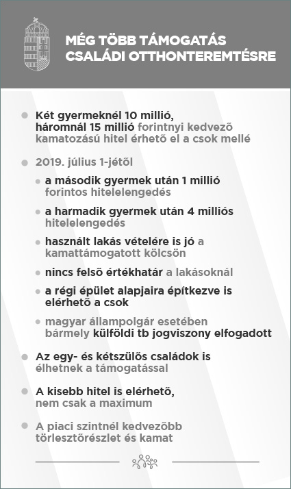A CSOK-nak, a kedvezményes hitelnek és a jelzáloghitel-elengedés kiterjesztésének/ megemelésének köszönhetően egy második gyermeket vállaló család 12,6 millió forintot vehet igénybe, amelyen belül a 10 milliós hitelből 1 millió forintot elengedünk, így 3,6 millió forint vissza nem térítendő és 9 millió forint visszatérítendő, de kedvezményesen törleszthető juttatásban részesül. Egy harmadik gyermeket vállaló család 25 millió forintot kap a CSOK-nak és a kedvezményes hitelnek köszönhetően, amelyen belül a 15 milliós hitelből 4 millió forintot elengedünk, így lényegében 14 millió forint a vissza nem térítendő, és 11 millió forint a visszatérítendő, de kedvezményesen törleszthető összeg.